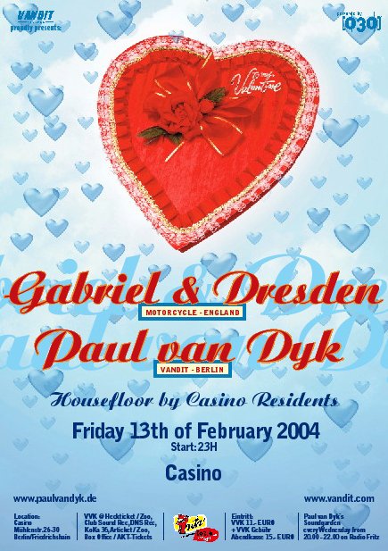 Freitag, der 13. - und so eine fette Party: Paul van Dyk lädt Gabriel & Dresden zu sich nach Berlin ins Casino ein. Los geht's um 23 Uhr, Eintritt 11 EUR (VVK) bzw. 15 EUR (Abendkasse). Hier noch dier Flyer.