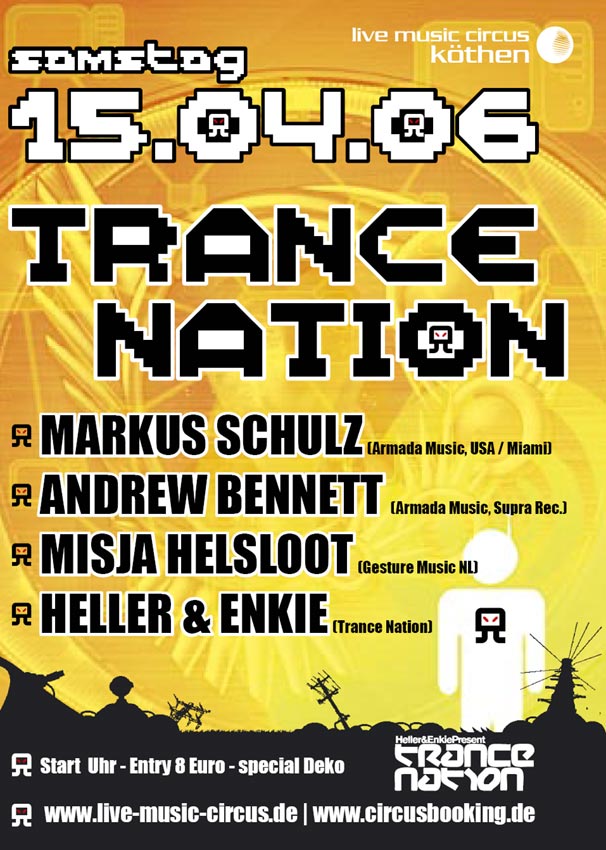 Leute, Leute der April wird voll... am Ostersamstag gehts nach Köthen. Niemand geringeres als unser heißester Progresssiv- Exportschlager aus Miami ist zu Gast, Markus Schulz. Misja Helsloot aus Holland und Andrew Bennett werden ebenfalls am Start sein. Ein fetter Abend/ Nacht ist hier wohl garantiert. ![]()