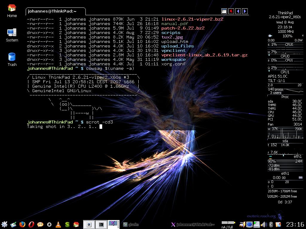 Ich hab auch die 3D-Effekte aktiviert (Xgl und compiz) nutze das aber kaum. Diese Effekte stellen jedes Windows-System in den Schatten, aber das ist mir egal, weil man damit nicht wirklich gut arbeiten kann.