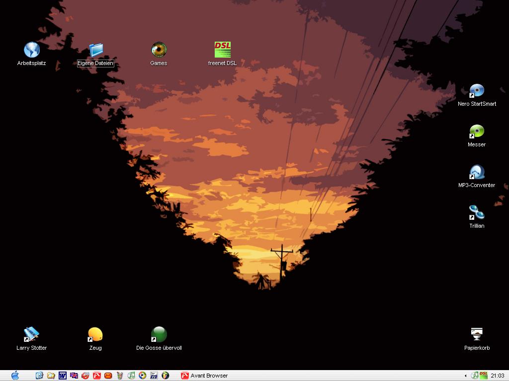Mein Desktop ist rabenschwarz, also kaum herzeigenswert, noch dazu übersät mit Icons... aber muss eh bald formatieren, bevor mein Win endgültig seinen Geist aufgibt.