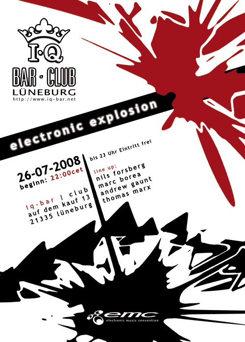 Nach langer Zeit sind wir von der electronic music convention endlich wieder da und rocken die IQ Bar in Lüneburg. Ich hoffe ein paar Leute aus dem Forum werden uns unterstützen und an diesem Abend mit am Start sein. Für die elektronischen Klänge sorgen gleich 4 Member aus dem Forum.