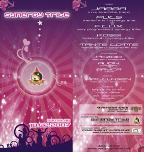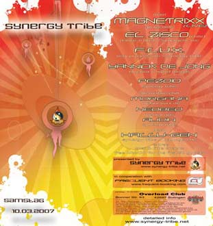 Synergy Tribe started in end of 2001 in Thailand and since then the Tribe organized events in Germany aswell as in Thailand with artists such as Peter Gun(ger), Atmos(swe), SBK(ger), Noma(swe), Bakke(swe), Richard Kegg(uk), Sally Doolally(uk), Trancefeld(ger), Magnetrixx (ger), Philo, Klopfgeister and many more.