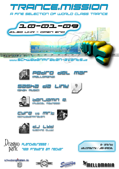 8€Nach langen Überlegungen und einer intensiven Suche nach der idealen Location haben sich die Macher von Schwabenpiraten-Events endlich dazu entschlossen, ihr anspruchsvollstes Tranceevent wieder aufleben zu lassen: Unter dem Motto Trance.Mission wird sich nun am 10. Januar 2009 die Diskothek DragonPark in Freiberg am Neckar in einen wahren Trance-Tempel mit massiver Lightshow und sattem Sound verwandeln. Geboten wird euch Trance der alten Schule - denn gespielt wird ausschließlich anspruchsvollster Sound und keinerlei Kommerz - und das alles bei fairen Eintritts- und Getränkepreisen! Mit am Start sind heute Nacht der Stuttgarter Meistertrancer und Mellomaniac Pedro del Mar - bekannt durch seinen Toperfolg "Seven Ways" und die aktuelle Hymne "Feel" auf Shah Music. Angefangen hatte für ihn alles vor langer Zeit im Stuttgarter Kultclub proTON - inzwischen tourt Pedro aber von Hollywood nach Shanghai und von Ibiza bis nach Südafrika, um nur einige seiner Destinationen zu nennen. Für alle Daheimgebliebenen gibt's seinen Sound zum Glück noch jede Woche in der Radiosendung "Mellomania" - und dann wären da ja noch die gleichnamigen Erfolgs-Compilations, die jeden eingefleischten Trancer regelmäßig beglücken. Umso mehr ist diese Party eine echte Pflichtveranstaltung! Den Support neben unserem Headliner liefert der Stuttgarter Sasha da Link - ebenfalls aus dem Hause Mellomania bzw. Shah Music und bekannt durch sein Projekt IngSha, der Frankfurter Neotrancer LXD (Resident @ TechnoClub Frankfurt) und Musical-Madness Gastgeber Benjamin R. Ebenfalls mit am Start sind die Stuttgarter Trancemaniacs und Trance.Mission-Gastgeber Cyre vs Mr.T (Nature One 2006 - 2008 )! Neben einer fantastischen Light- und Lasershow in einer edlen und größeren Location erwarten Euch außerdem einige Jägermeisterspecials. Alles in allem ist die perfekte Party damit wohl garantiert!