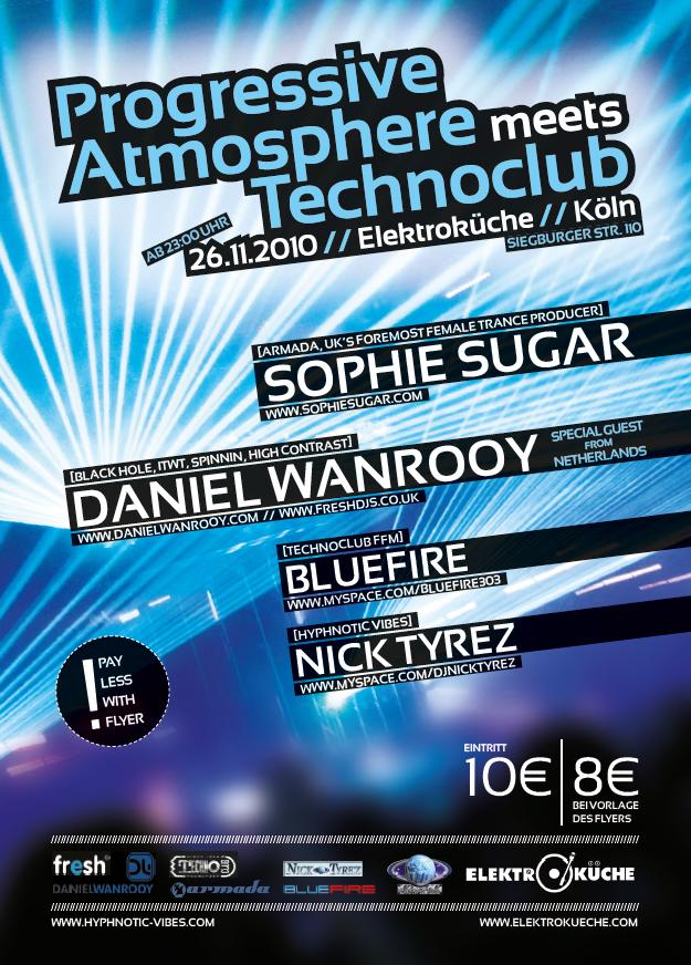 Es ist uns jedoch gelungen, hochkarätigen Ersatz für den 26.11. zu buchen: Sophie Sugar wird für Euch aus England in die Elektroküche kommen. Die "First Lady Of Trance", wie Armin van Buuren sie bezeichnet, ist mit ihren Releases "Call of Tomorrow", "Day Seven", "Together" u.v.m. in allen großen DJ-Playlisten vertreten und begeistert die Trancer auf der ganzen Welt mit ihrem melodischen Uplifting-Sound. Bei den Monday Bar-Events in Schweden ist Sophie Sugar gern gesehener Gast, auch im Technoclub in Frankfurt präsentierte sie schon ihren Sound und wird nun am 26.11. die Elektroküche zum Beben bringen!Wir freuen uns auf Euren Besuch am 26.11.2010 mit neuem Line up.