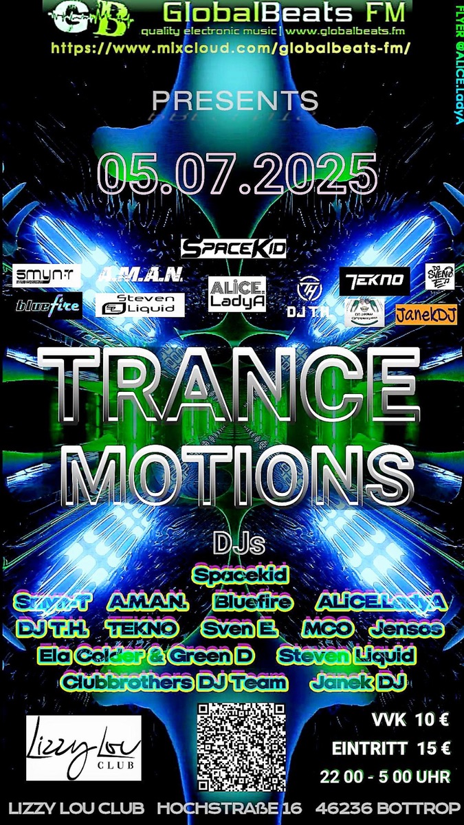 Das bedeutet 7 Stunden vollgepackt mit einer guten Mischung verschiedener Trancesounds, von Progressive über Uplfting bis hin zu Hard und Classics, eine ordentliche Ladung Trance-Power ist an diesem Abend mit dem Line-Up garantiert. für jedes Trance-Herz werden wir den passenden Sound haben.