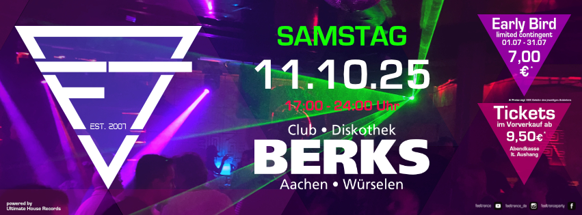 Nach der letzten Ausgabe im September mit guter Musik und toller Stimmung haben wir richtig Lust auf eine Fortsetzung! Mit der nächsten FEEL TRANCE wollen wir weiter einen Treffpunkt der Tranceszene gestalten sowie die Aufrechterhaltung der Clubkultur ermöglichen. Dazu werden wir am 4.November erstmalig im BERKS in Würselen bei Aachen zur 48.Ausgabe der FEEL TRANCE die Türen öffnen und den Sound erklingen lassen.