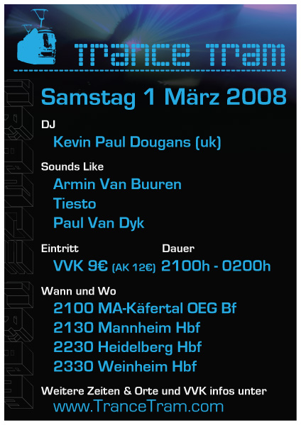 [2008-03-01] Trance Tram @ Strassenbahn 5R, Mannheim/Heidelberg yunimoon 19. Februar 2008 um 14:27 Hey Kev!Geil! Klar sind wir dieses Jahr wieder dabei!!Letztes Jahr war schon Genial!!!!!Leg mir doch bitte gleich ein Ticket zurück und das nächste mal gibst du mir sofort bescheid;)) Lots of kissesLara
