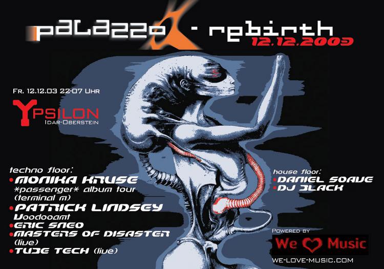 Die Palazzo-Betreiber Udo Niebergall und Joachim Muno haben eine neue Location gefunden, die dem alten Palazzo sehr ähnlich, und nur 30 min. davon entfernt ist: Das YPSILON in Idar-Oberstein, in dem 1995 das legendäre Space-Woodstock-Festival stattgefunden hat. Damals pilgerten über 10.000 Feierwütige zum 3-Tages-Festival nach Idar-Oberstein. Seitdem war das Ypsilon lange Zeit geschlossen. Die Palazzo-Crew wird jährlich ca. 4 Veranstaltungen im Ypsilon durchführen, jede ein Highlight für sich.Am Freitag, dem 12.Dezember findet die erste PALAZZO REBIRTH-Party in der neuen Location statt. Dort präsentieren Monika Kruse und Patrick Lindsey ihre “PASSENGERS” Album-Tour (Terminal M, Voodooamt). Zudem legt der langjährige Palazzo-Resident-DJ ERIC SNEO auf, der mit seinem Sommerhit “Ciao Bella” die deutschen und französischen DJ-Charts gestürmt hat.