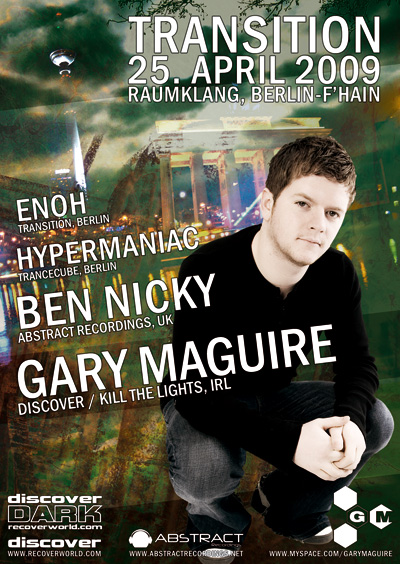 Nach einem aufregendem Jahr und sechs großartigen Parties ist es nun an der Zeit, das erste Jubiläum der TRANSITION zu feiern. Zu diesem Anlass haben wir als Main-Act den irischen Newcomer GARY MAGUIRE eingeladen. In seiner noch relativ jungen Karriere als Produzent und DJ kann er bereits auf beachtliche Erfolge zurückblicken. Sein Debüt auf dem englischen Label Discover Dark "Borderline" erhielt internationales Ansehen, während seine Collaboration mit John Askew "Thumb It In" direkt auf dessen aktuellem Artist-Album "Z List Uber Star" gefeatured wurde. Unter seinem Alias Last Man Standing remixte Gary u. a. Matt Hardwicks "Supernal", die erste Single des neuen Labels Kill The Lights. Gerade erschienen ist sein Remix von Aled Manns "To The End", danach steht die Veröffentlichung seines nächsten Geniestreichs "One Way" auf Discover an, gefolgt von weiteren Remixen und Tracks in Zusammenarbeit mit verschiedenen Künstlern. Kein Wunder also, dass seine Produktionen und Remixe in den Plattenkoffern internationaler Top-DJs wie Armin van Buuren, Paul van Dyk und Above & Beyond zu finden sind und supportet werden.