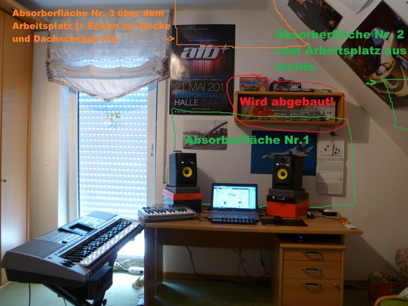 Reicht es, wenn ich Absorber an der Wand hinter den Boxen befestige (nicht die ganze Wand nur die 'Problemzonen') oder muss ich auch noch welche unter der Decke, an der Dachschräge rechts von mir und in den Ecken (zur Decke und Dachschräge) befestigen? -