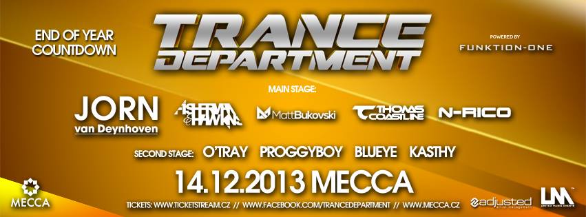 ºTickets: http://bit.ly/1bC1tUqThe last Trance DEPARTMENT of 2013! Two weeks before the end of the year we will close it with a BANG and start the Ënd of year Countdown”. We bring you 4 international DJs divided over 3 acts.